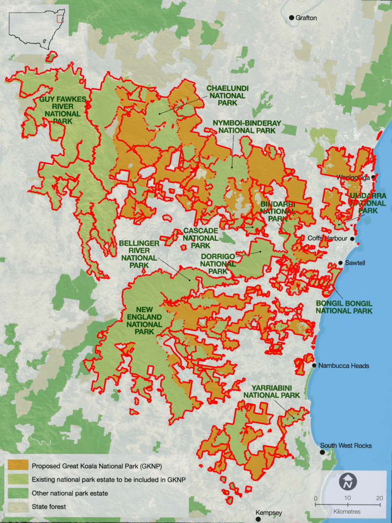 The size of the Government park, at approximately 475,000 ha is considerably larger than the 316,000 ha national park first proposed in 2013. This is much closer to the 493,000 ha KHSRC and the Friends recommended in their proposal, and in their submission to the koala park process.